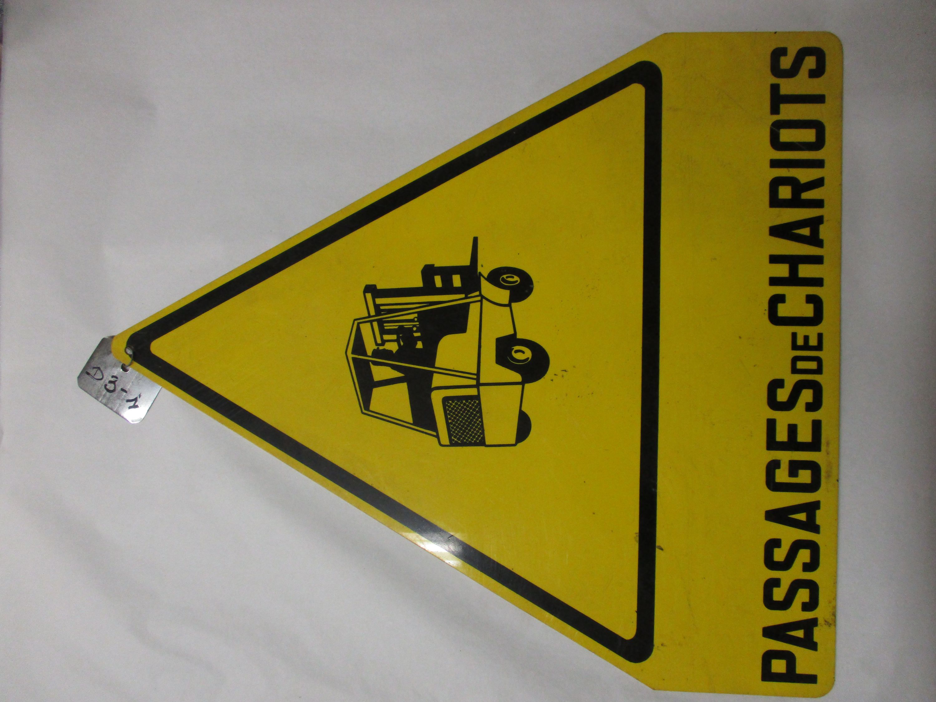 Plastique fond jaune lettres et dessin noirs : PASSAGE DE CHARIOTS