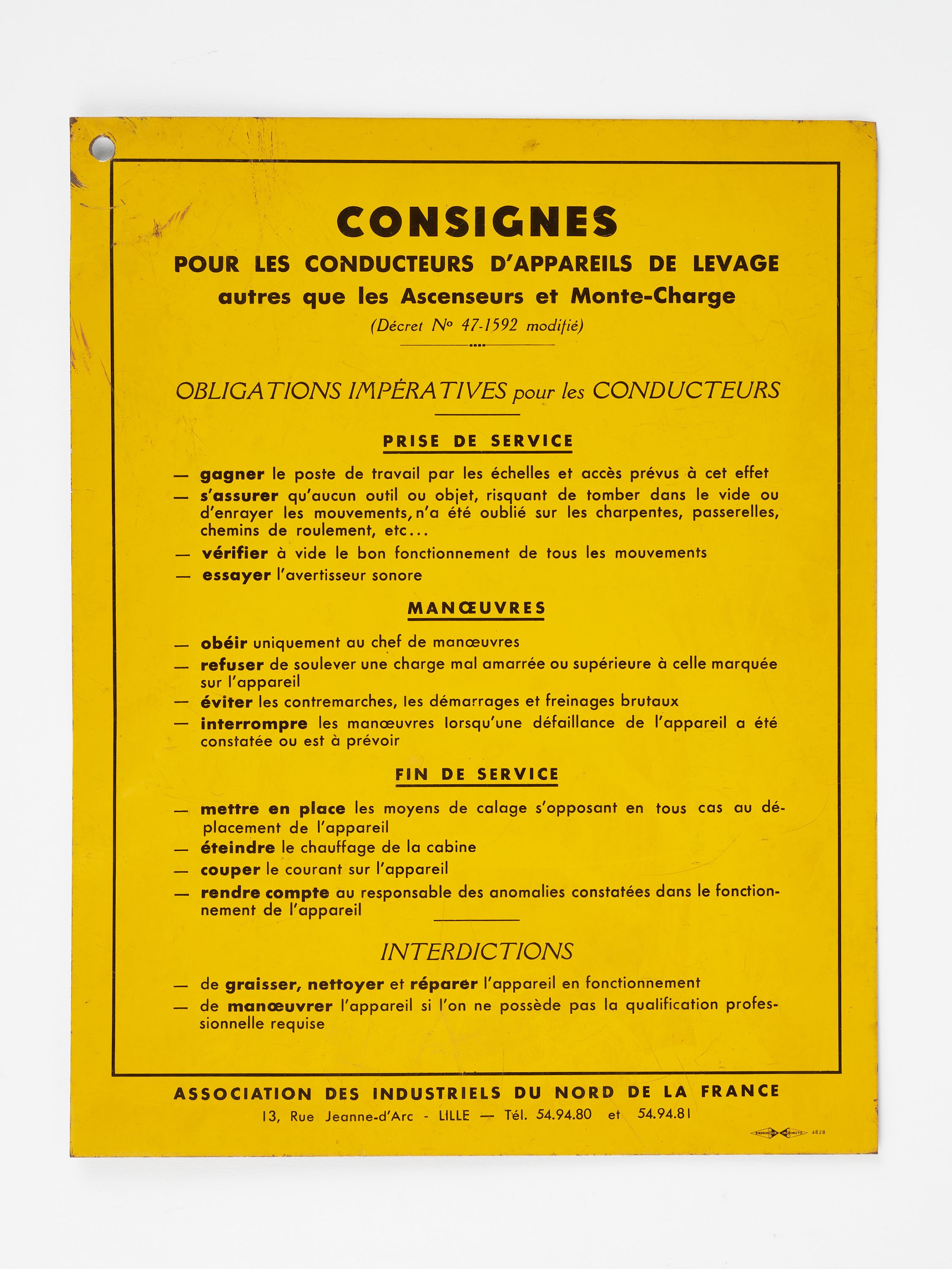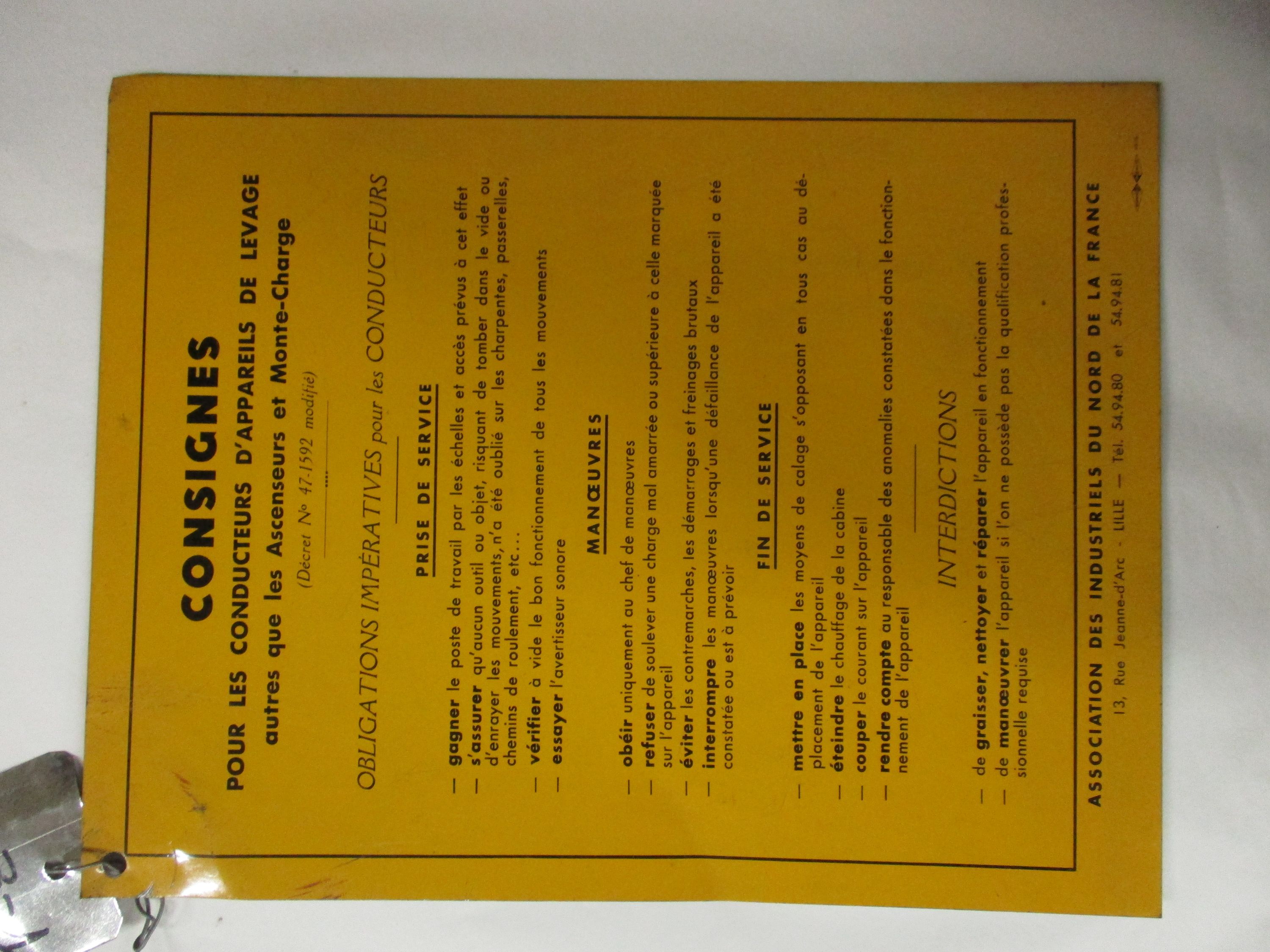Tôle fond jaune lettres noires : Consigne pour les conducteurs d'appareils de levage autre que les ascenseurs et monte-charge (Décret n°47/1592 modifié)