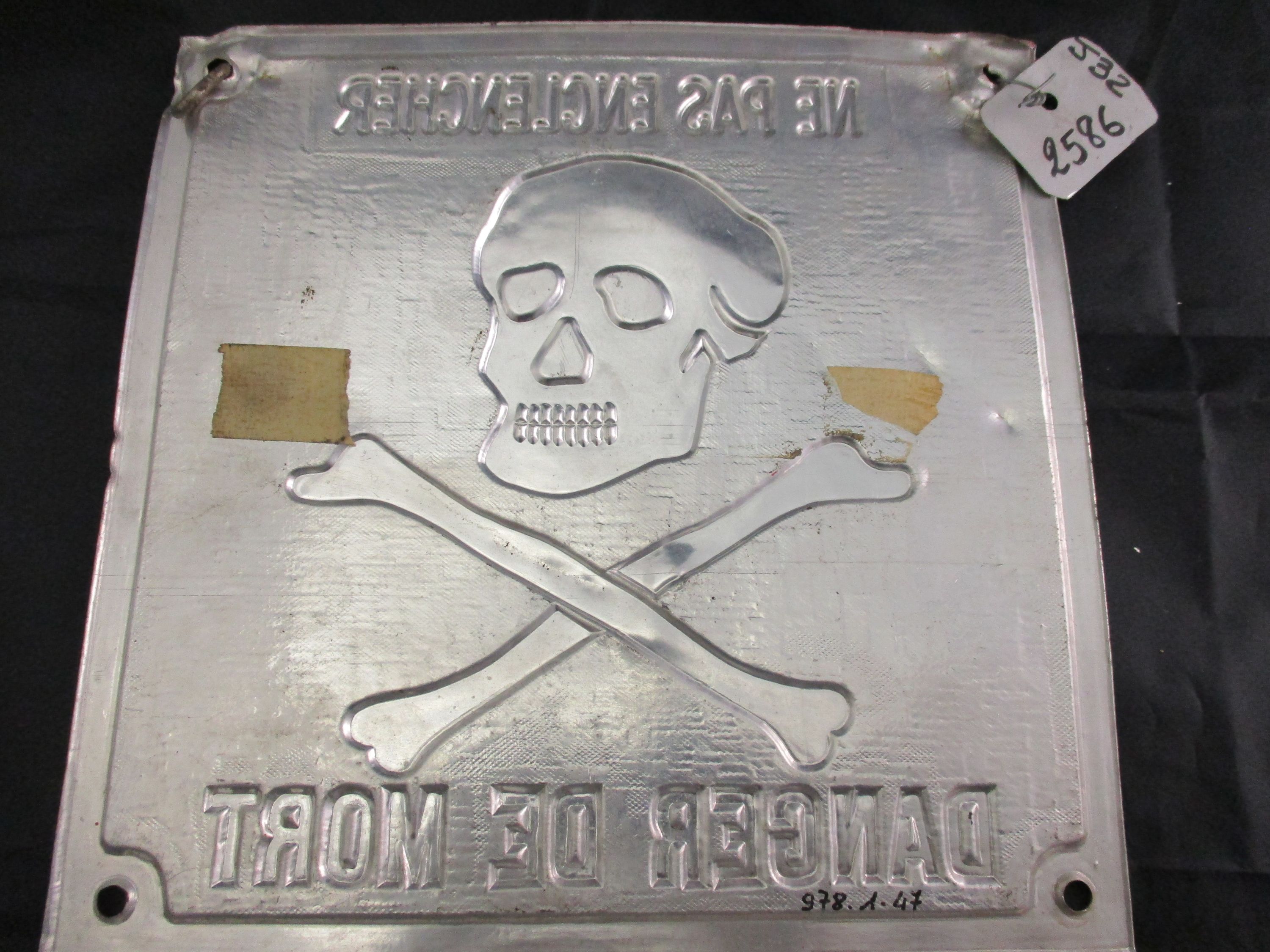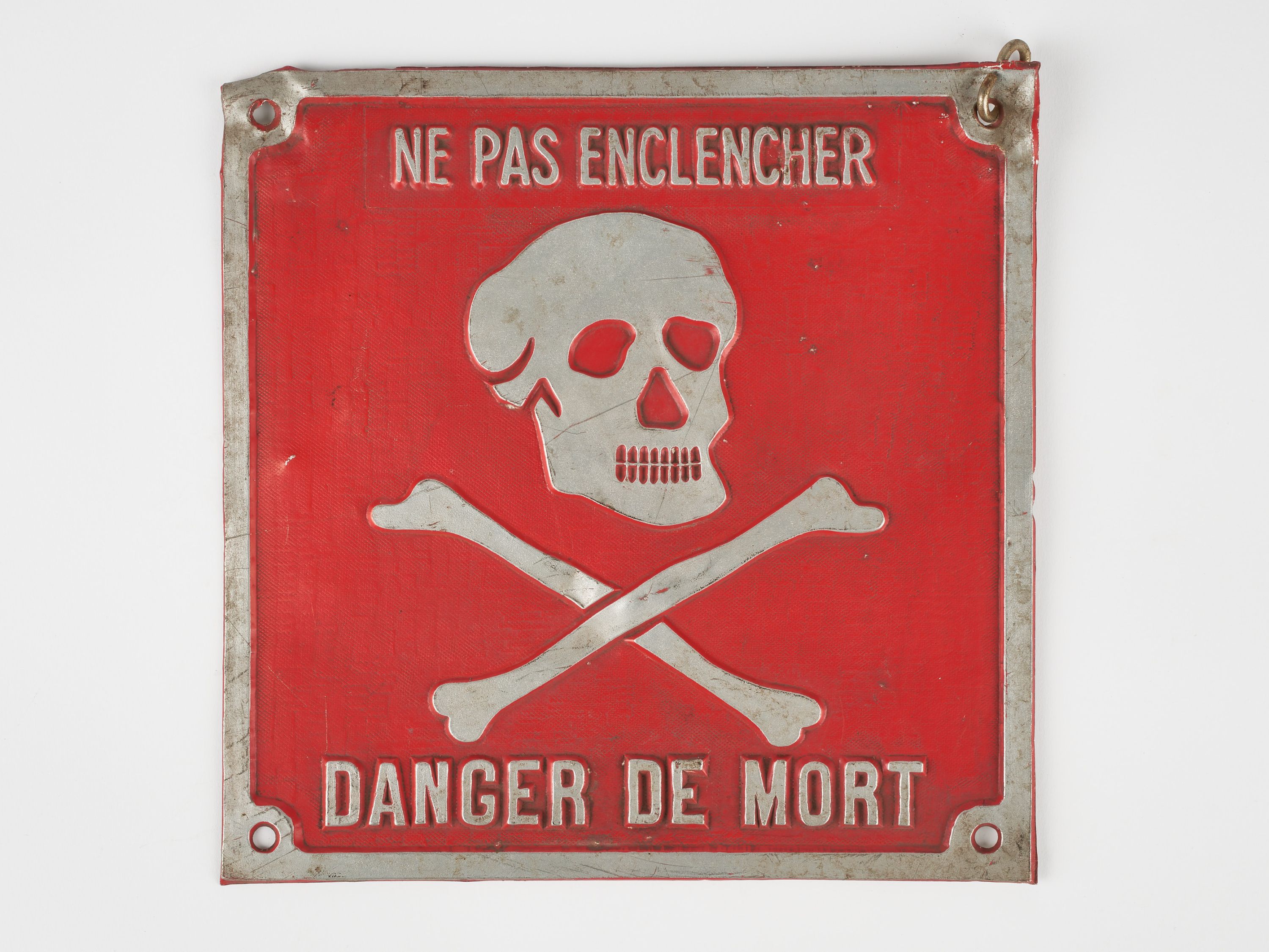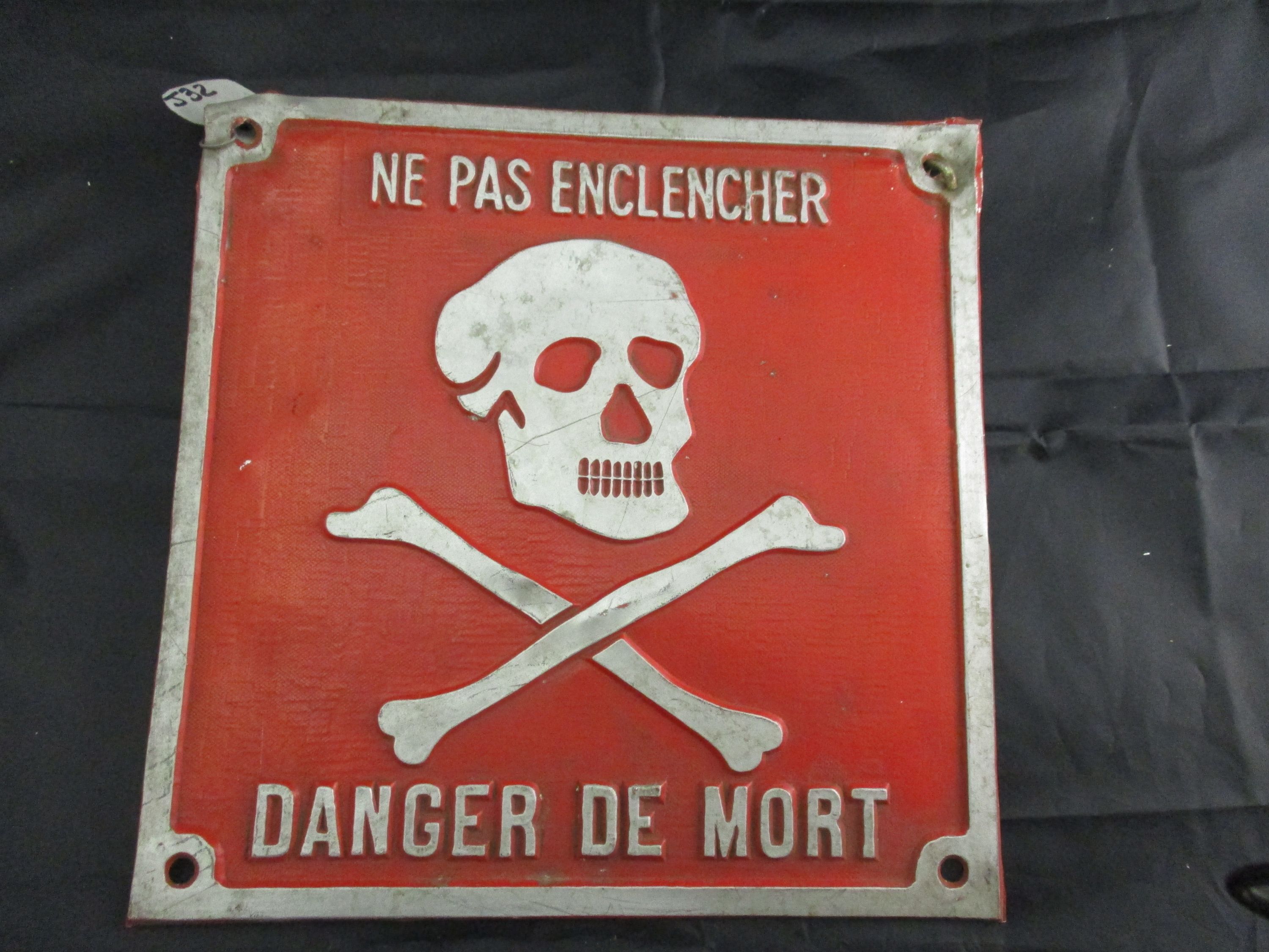 Alu fond rouge lettres et dessin relief gris : NE PAS ENCLENCHER - DANGER DE MORT