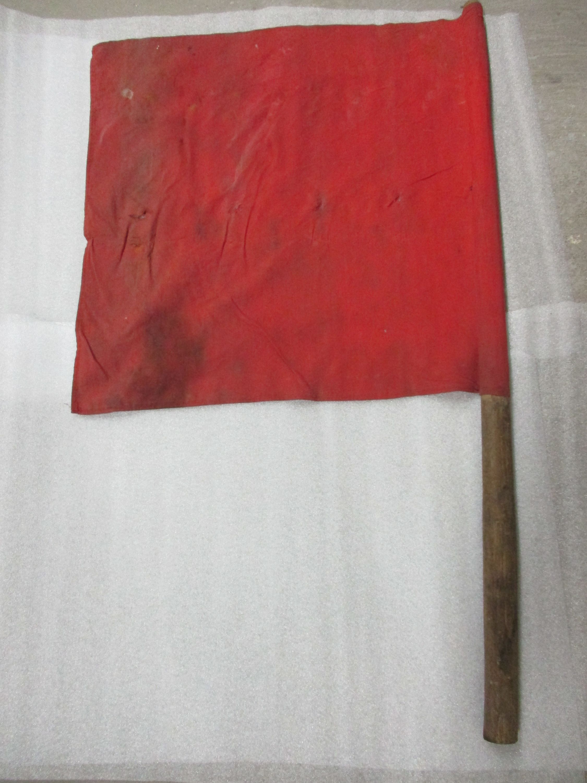 Petit drapeau en tissu rouge fixé sur un long manche en bois appelé "guidon de chef de gare"