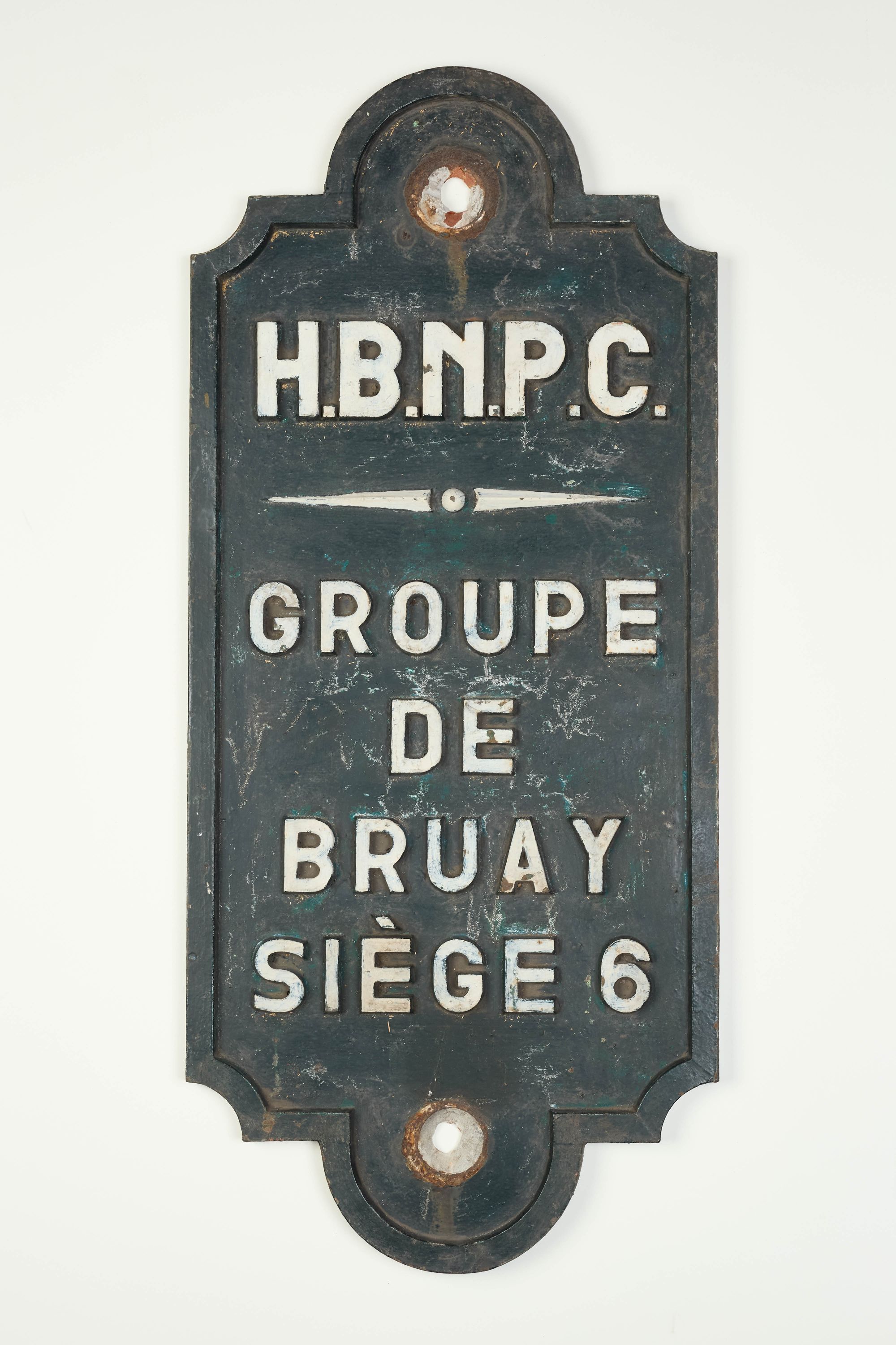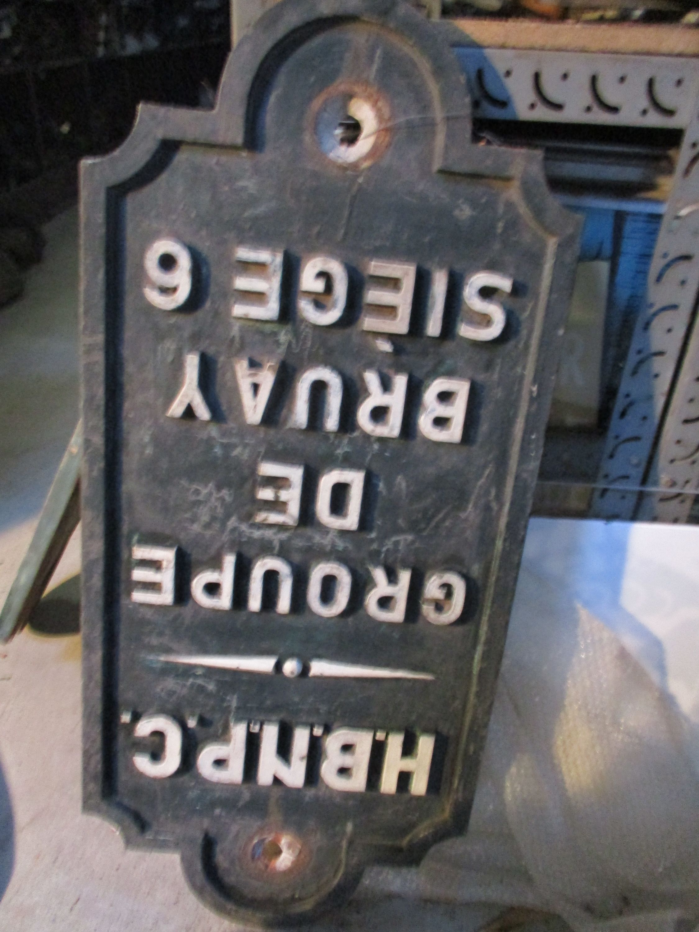 Plaque en fonte fond vert lettres en relief blanches : HBNPC GROUPE DE BRUAY - SIEGE 6
