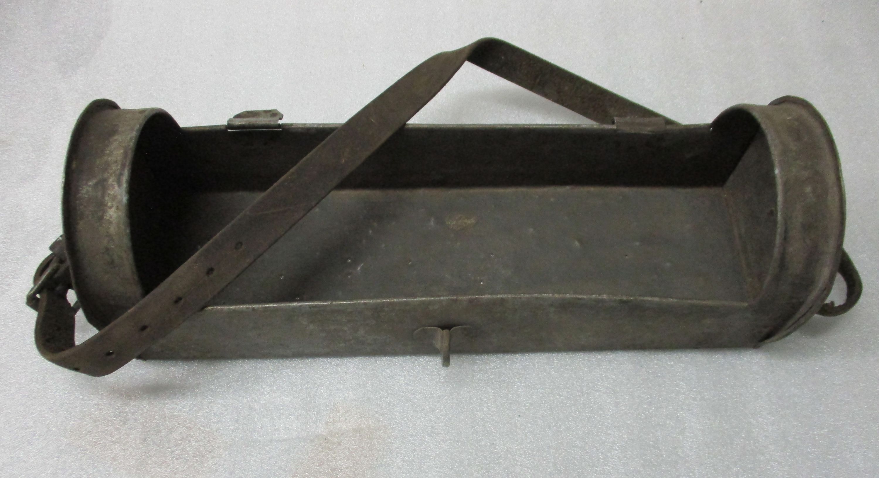 Caisse à outils composée d'un contenant en métal dont le couvercle manque et d'une bandoulière en cuir.