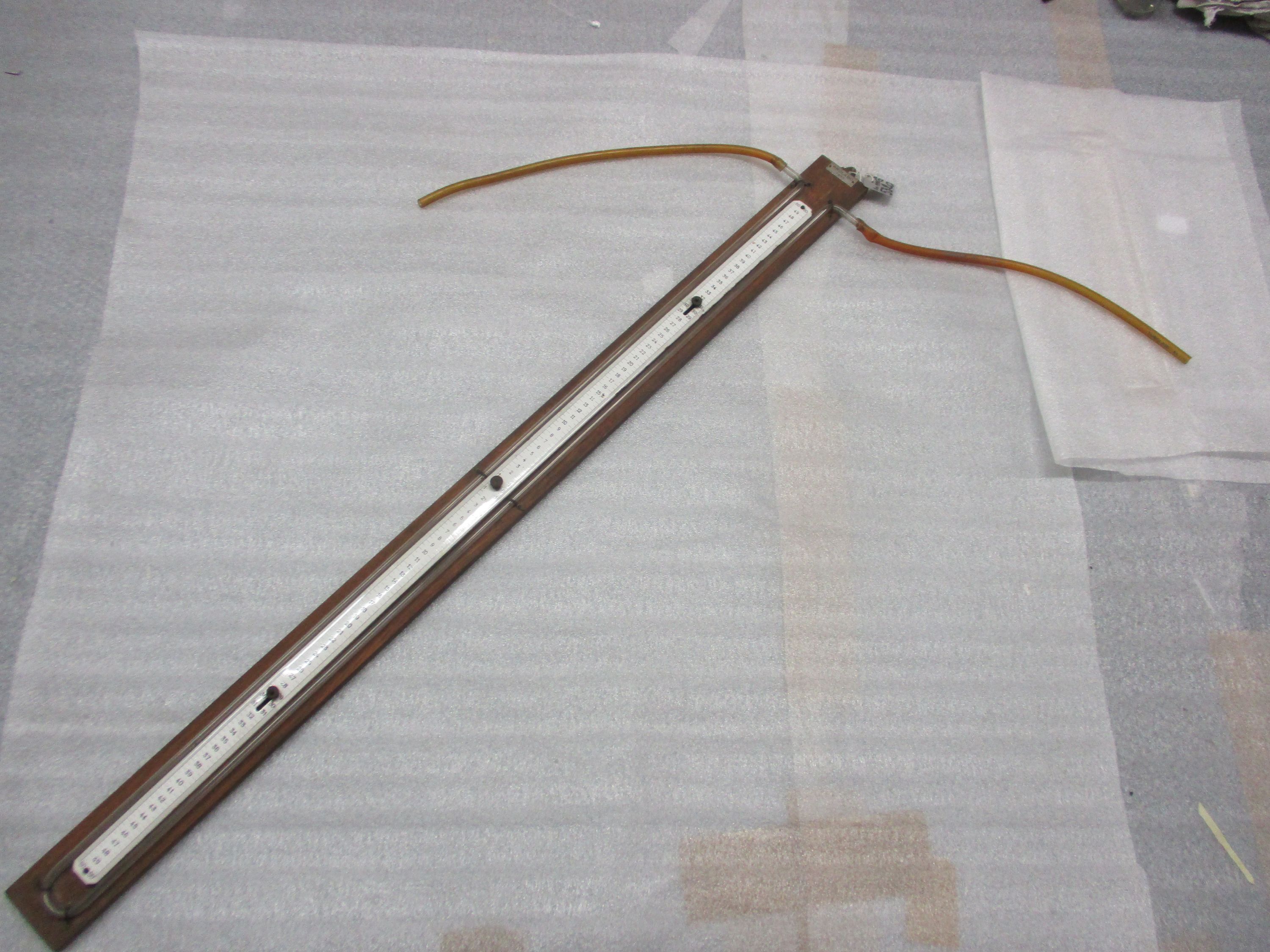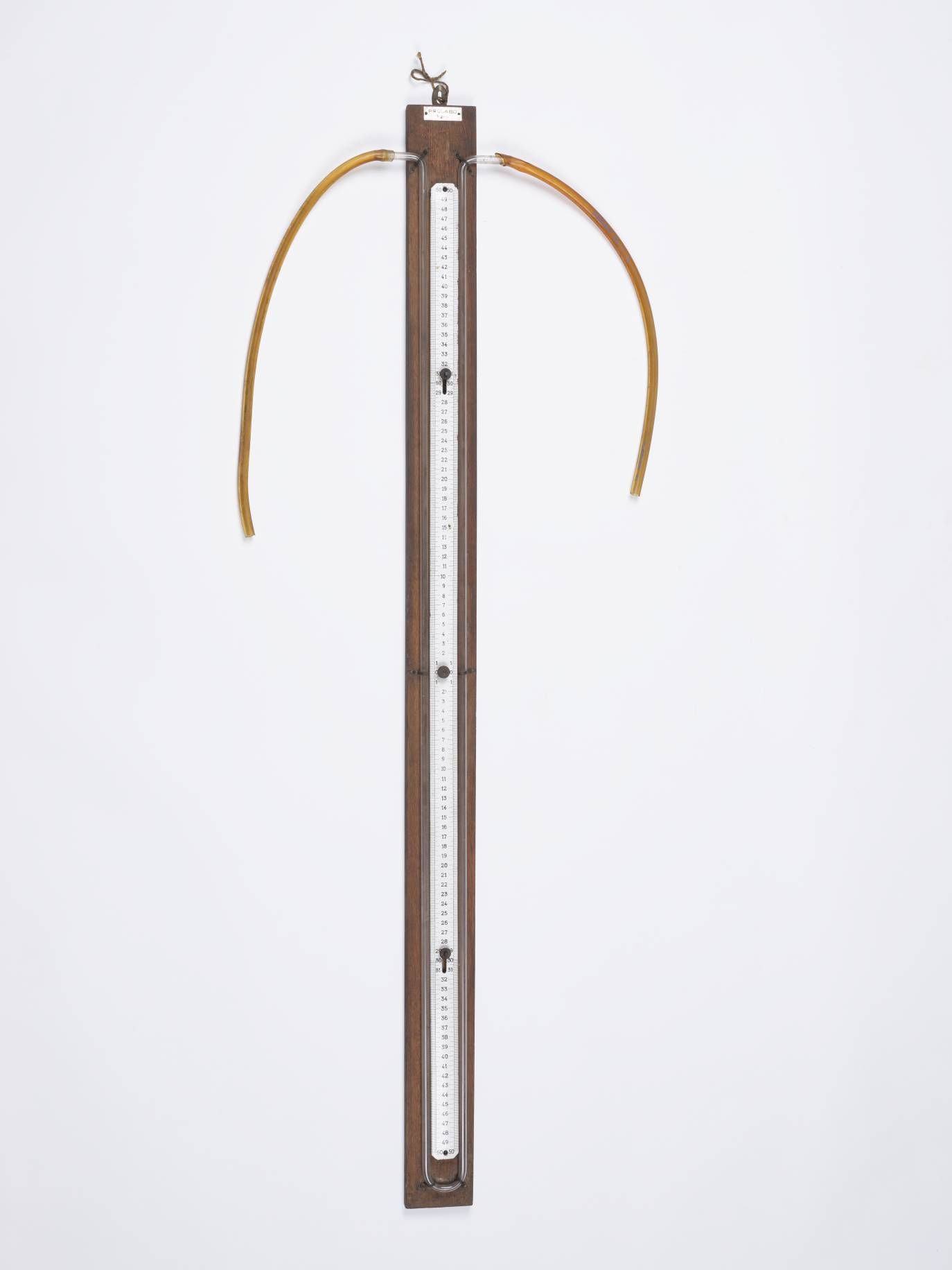 Manomètre composé d'un tube en verre en forme de U fixé sur un support en bois, avec une graduation qui va de 0 à 50. Un tube en caoutchouc est fixé à chaque extrémité du tube.