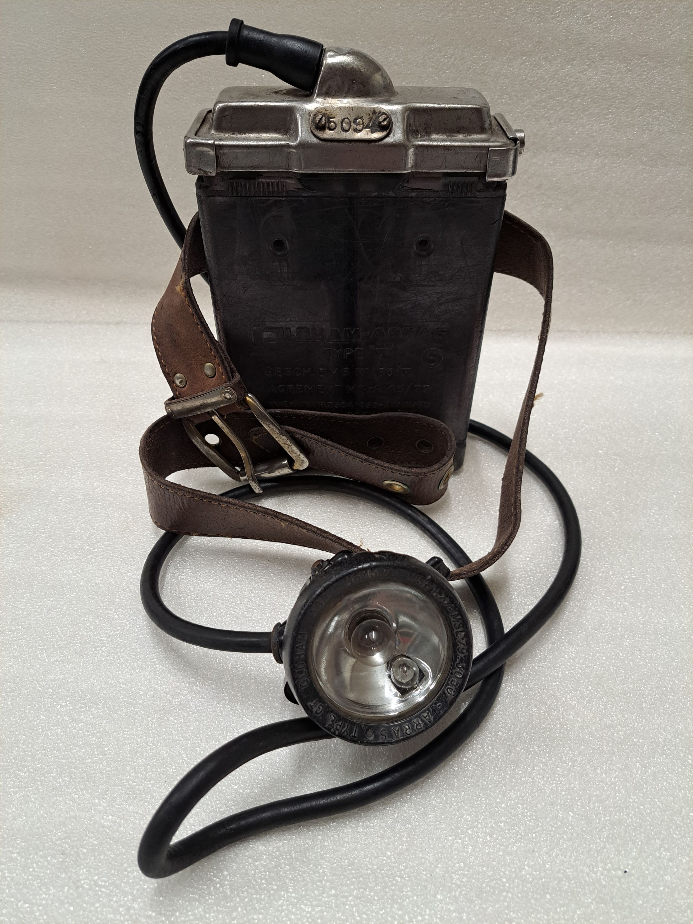 Lampe de mine au chapeau de marque Oldham-Arras type T composée d'un accumulateur en plastique noir transparent, d'un flexible et d'un phare.
