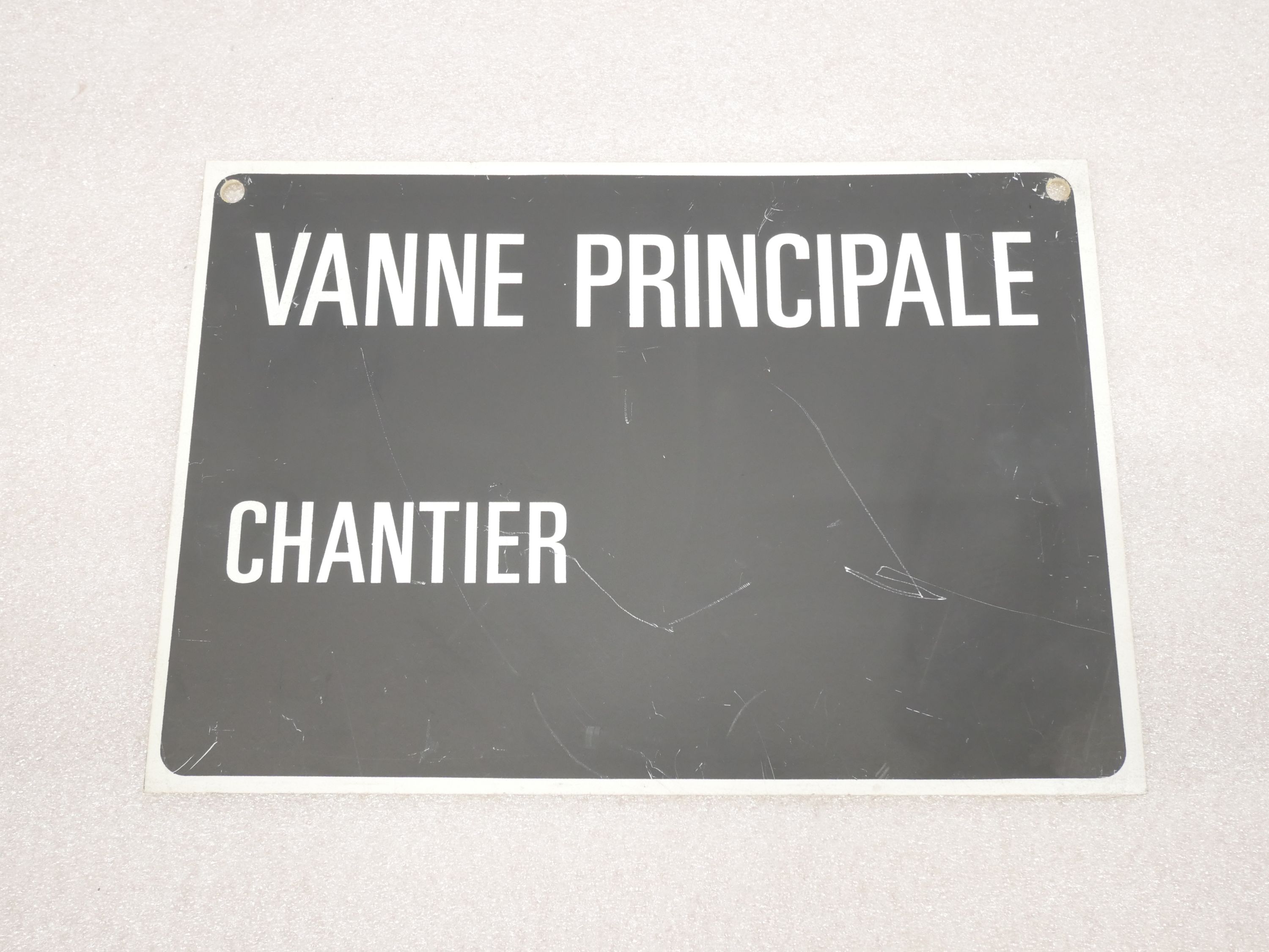Panneau rectangulaire en plastique à fond noir avec une inscription en blanc.