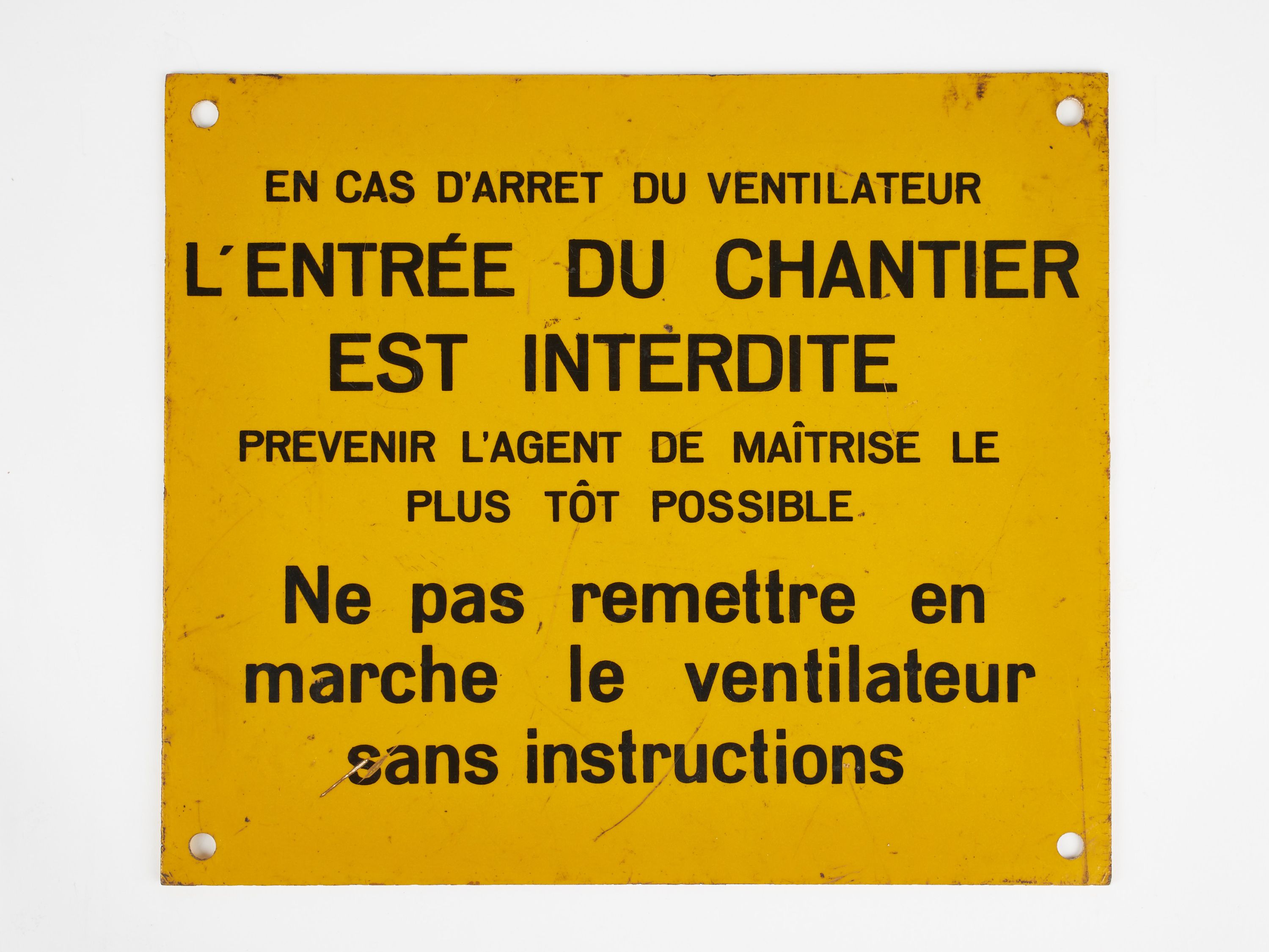 Panneau rectangulaire en plastique à fond jaune avec une inscription en noir.