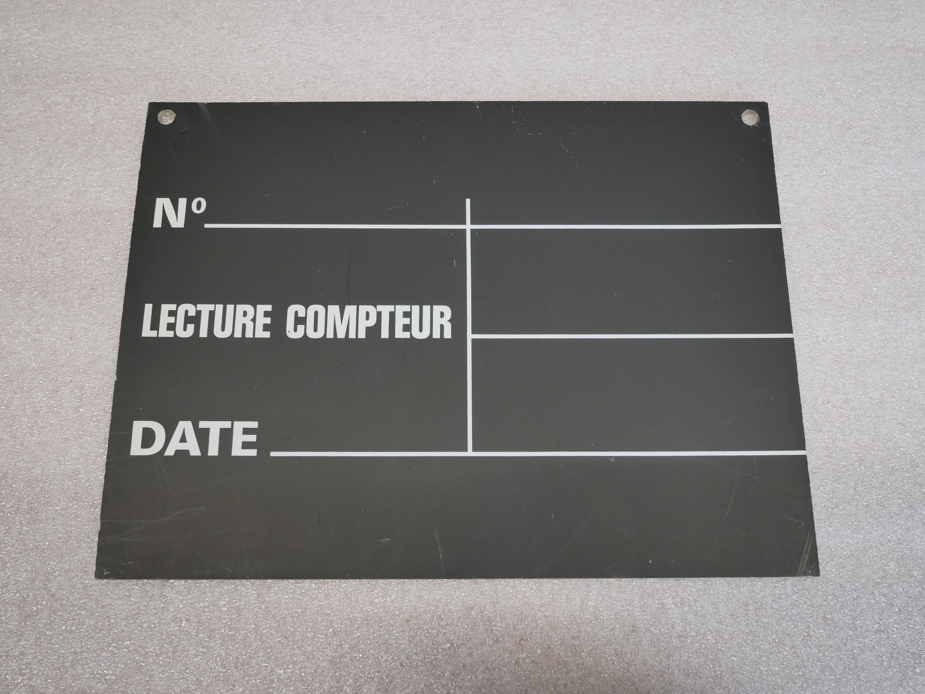 Panneau rectangulaire en plastique avec une face blanche et une face noire. Sur celle-ci, il est possible de compléter l'inscription avec des mentions à la craie. Ce panneau servait au contrôle des compteurs d'eau.