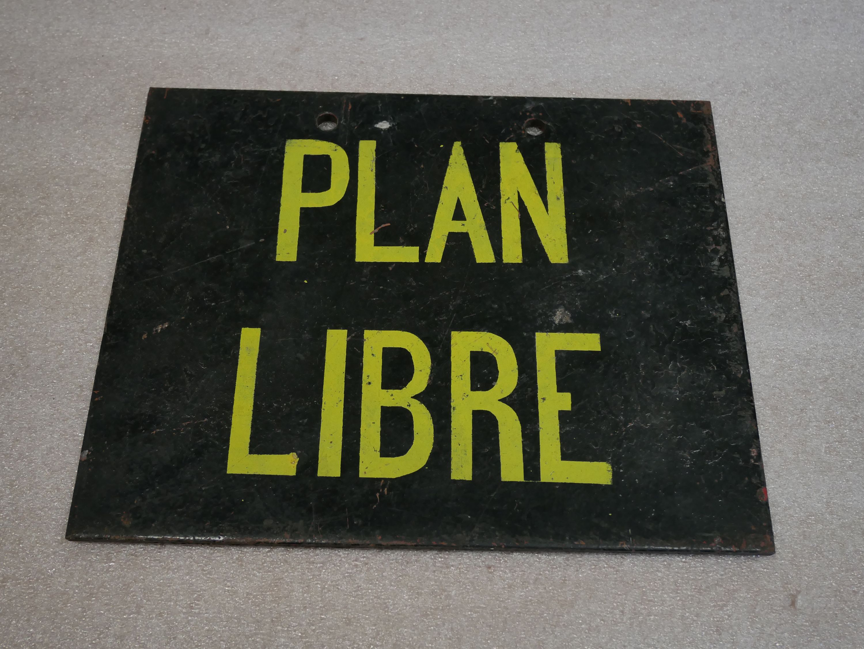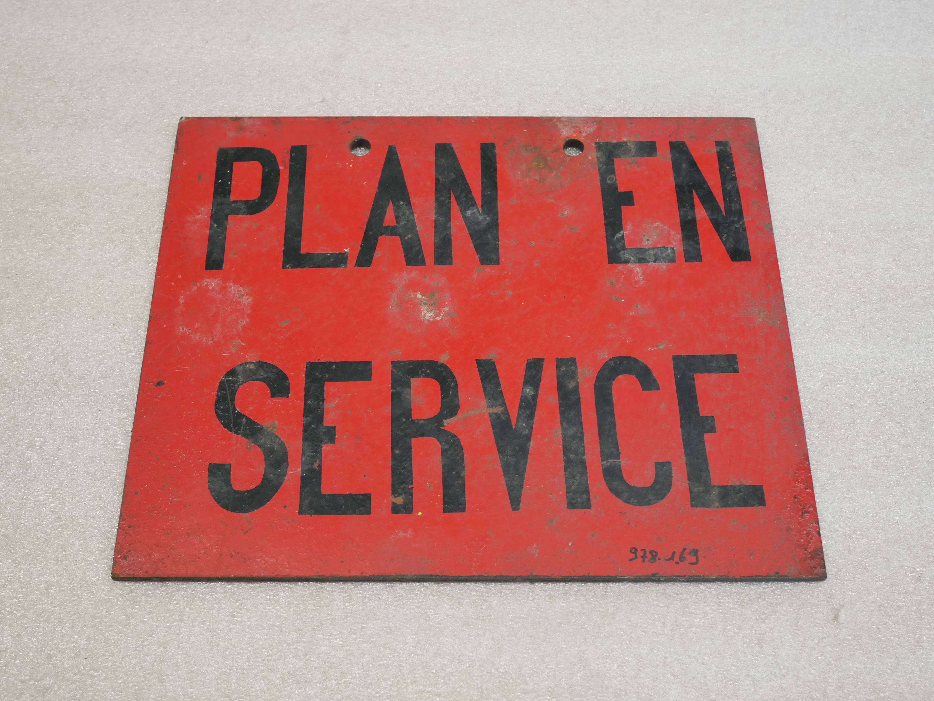 Panneau rectangulaire en fonte. Une face porte une inscription noire sur un fond rouge. L'autre face porte une inscription jaune sur un fond noir.