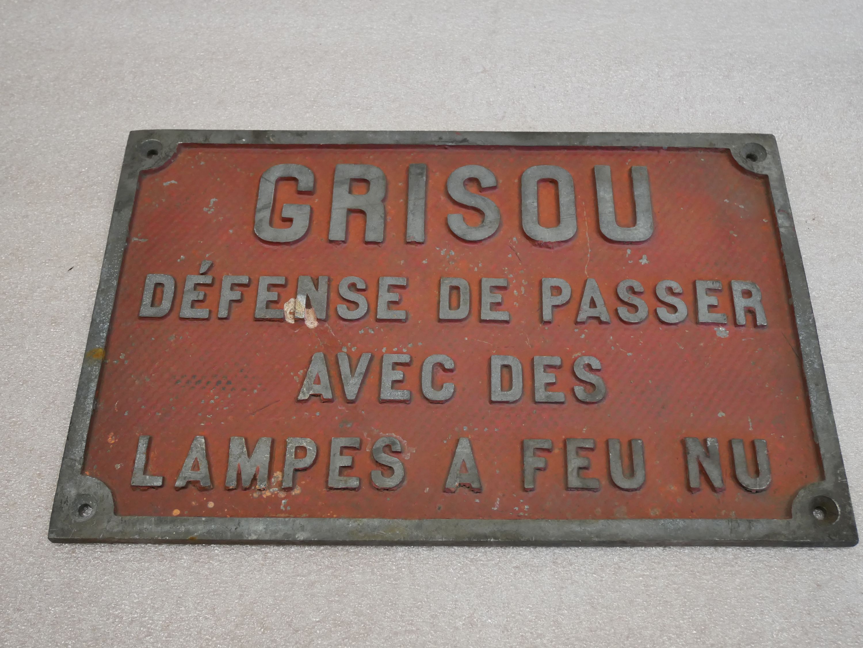 Panneau rectangulaire en duralumin portant une inscription en relief sur un fond peint en rouge.