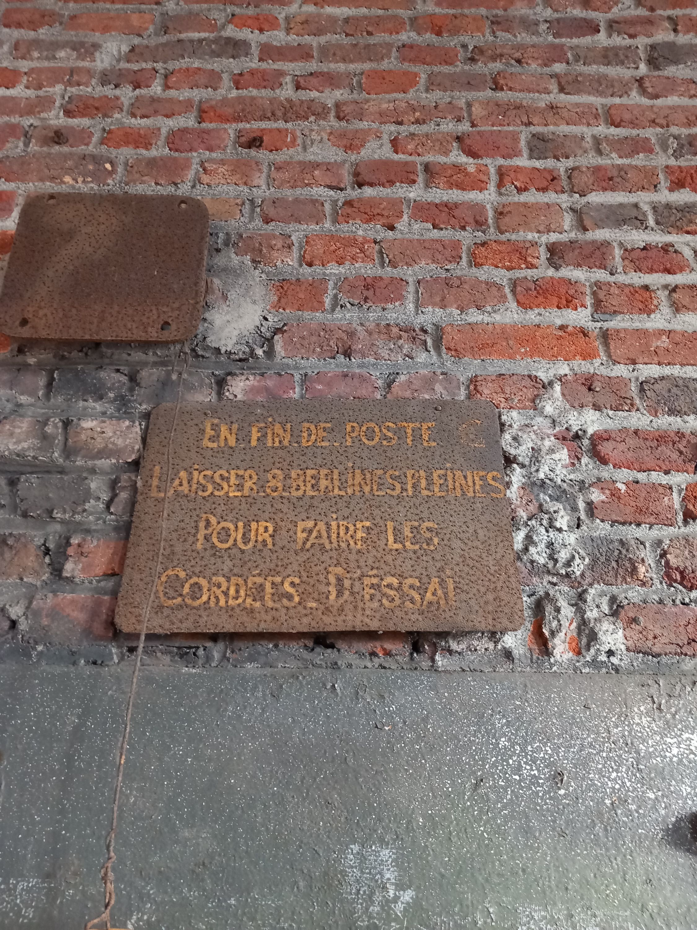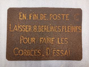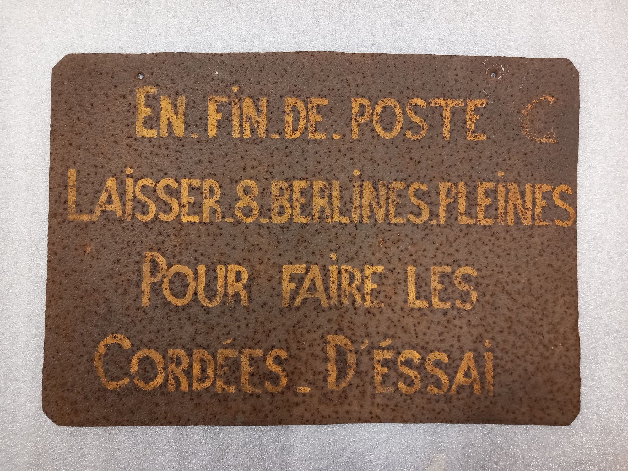 Panneau rectangulaire en métal portant une inscription en jaune.
