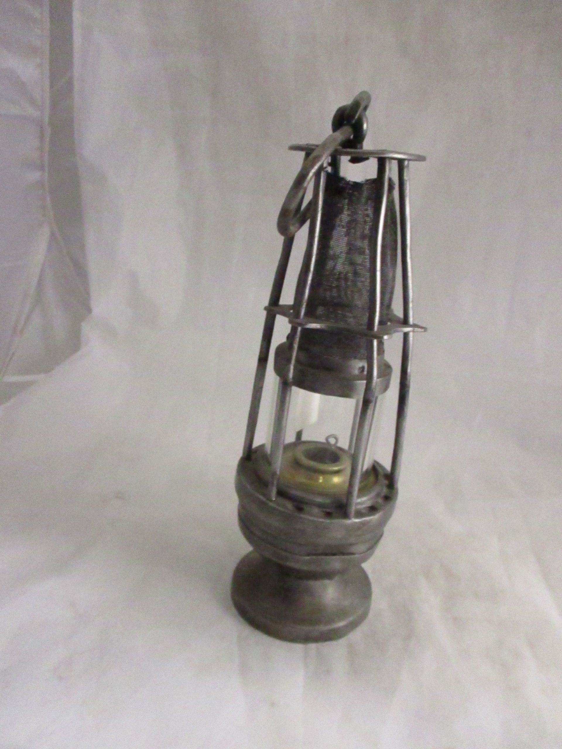 Lampe de mine à huile de type Mueseler de marque Cosset-Dubrulle composée d'un réservoir en forme de piédouche, d'une cage, d'un verre, d'un tamis et d'un crochet de suspension.