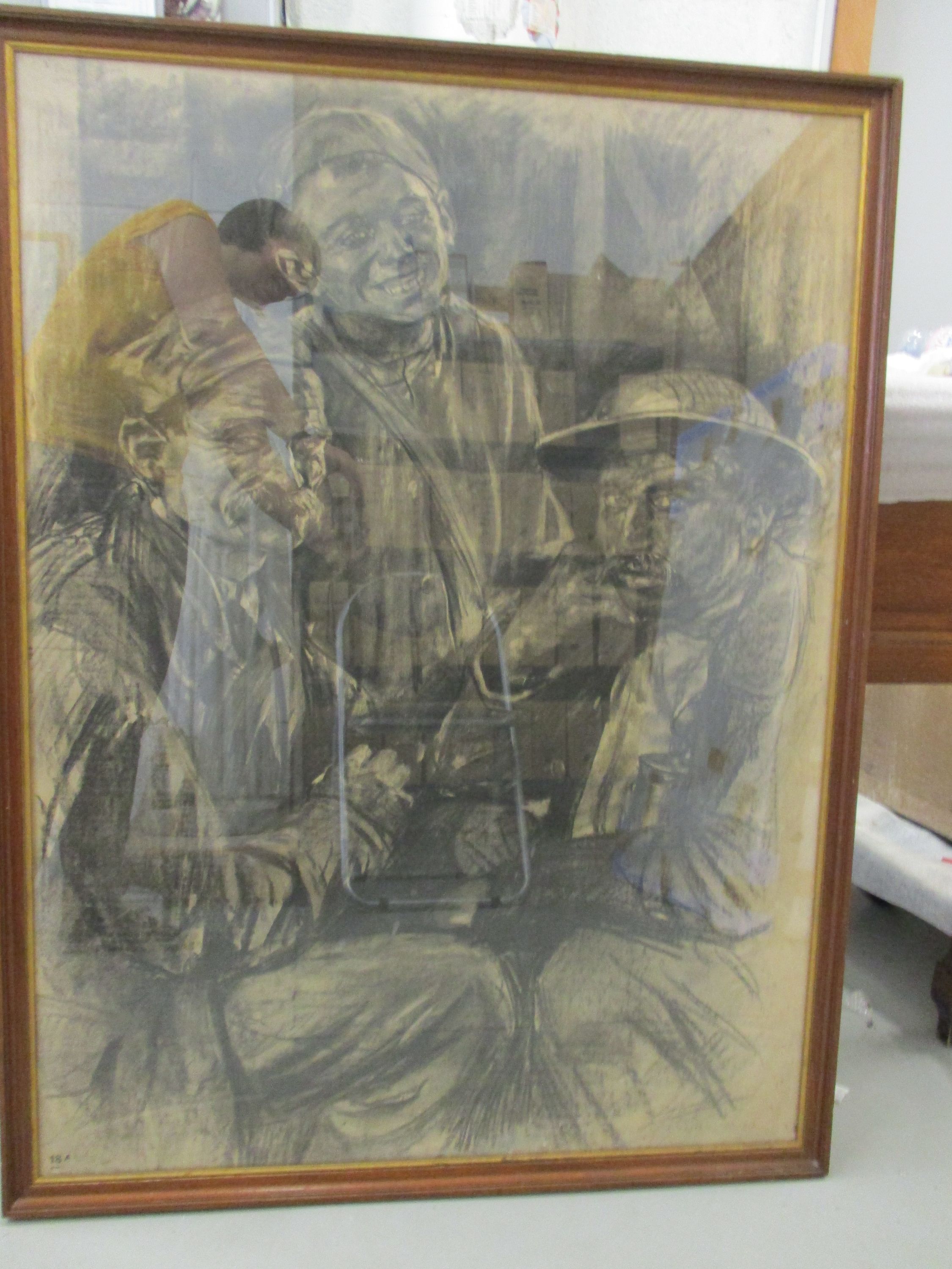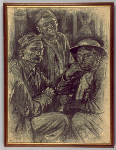 Fusain de Lucien Jonas représentant trois mineurs dont un galibot devant la cage.