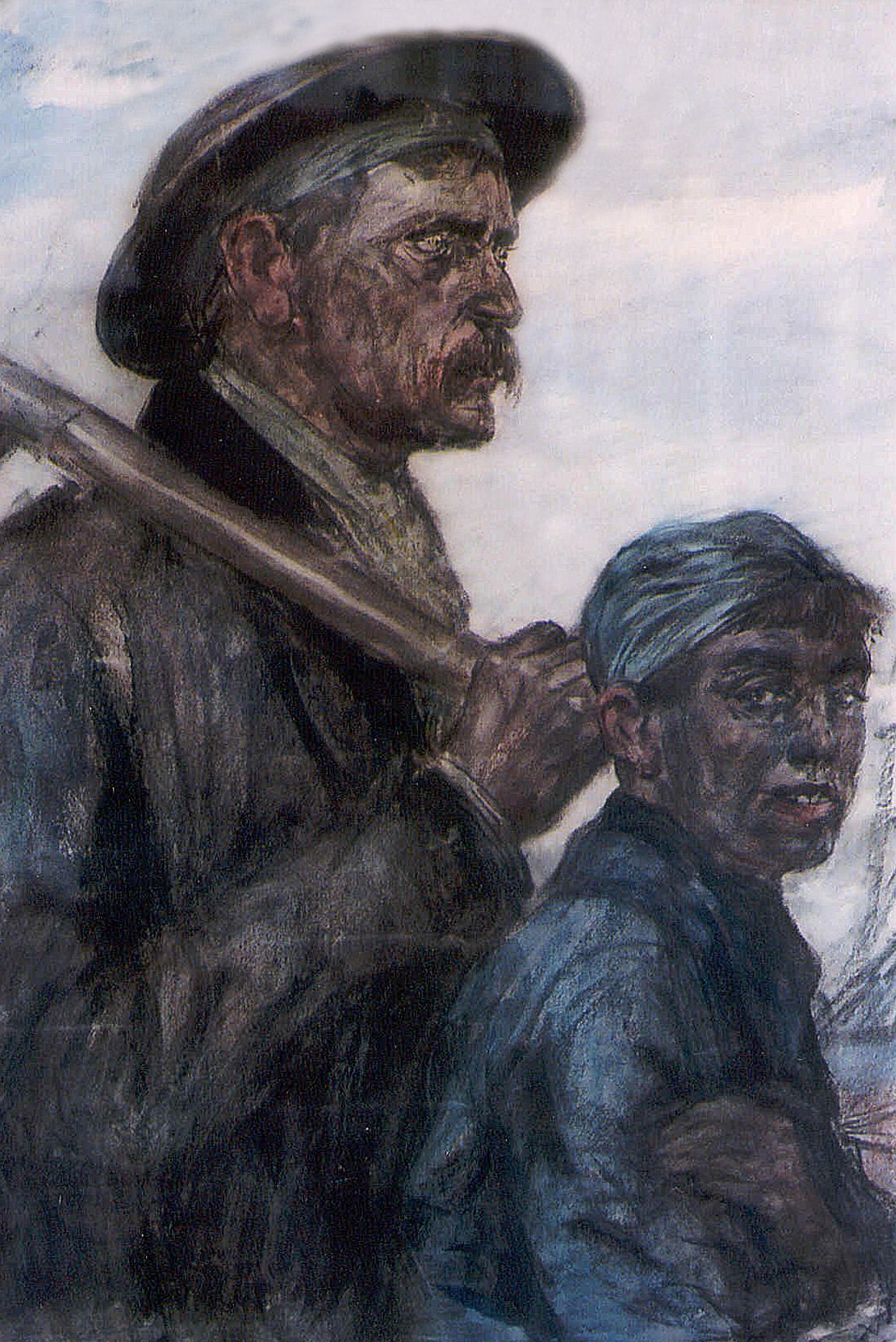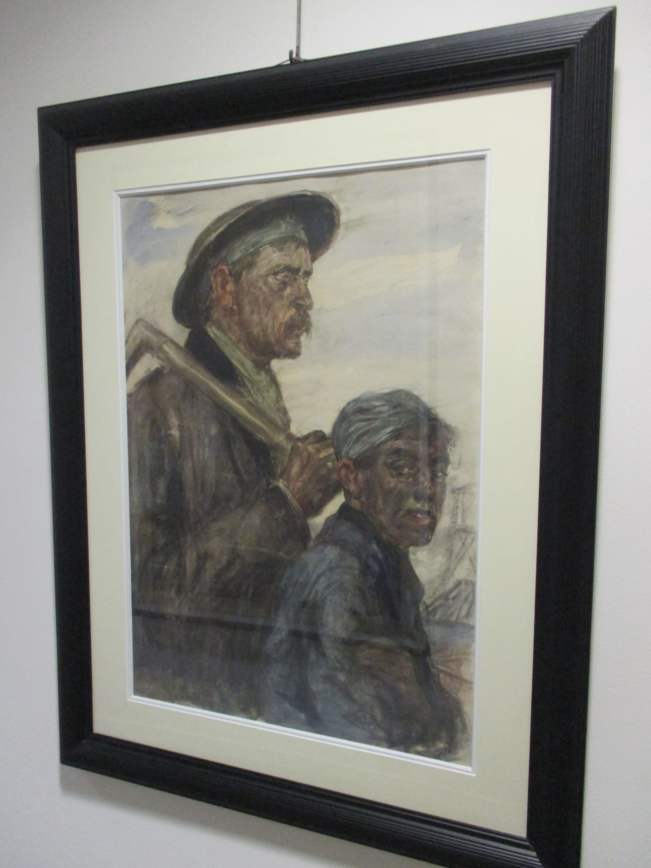 Peinture représentant un mineur et un galibot rentrant après leur journée de travail. Le mineur adulte porte une barrette et un pic sur l'épaule. Le galibot est coiffé d'un béguin.