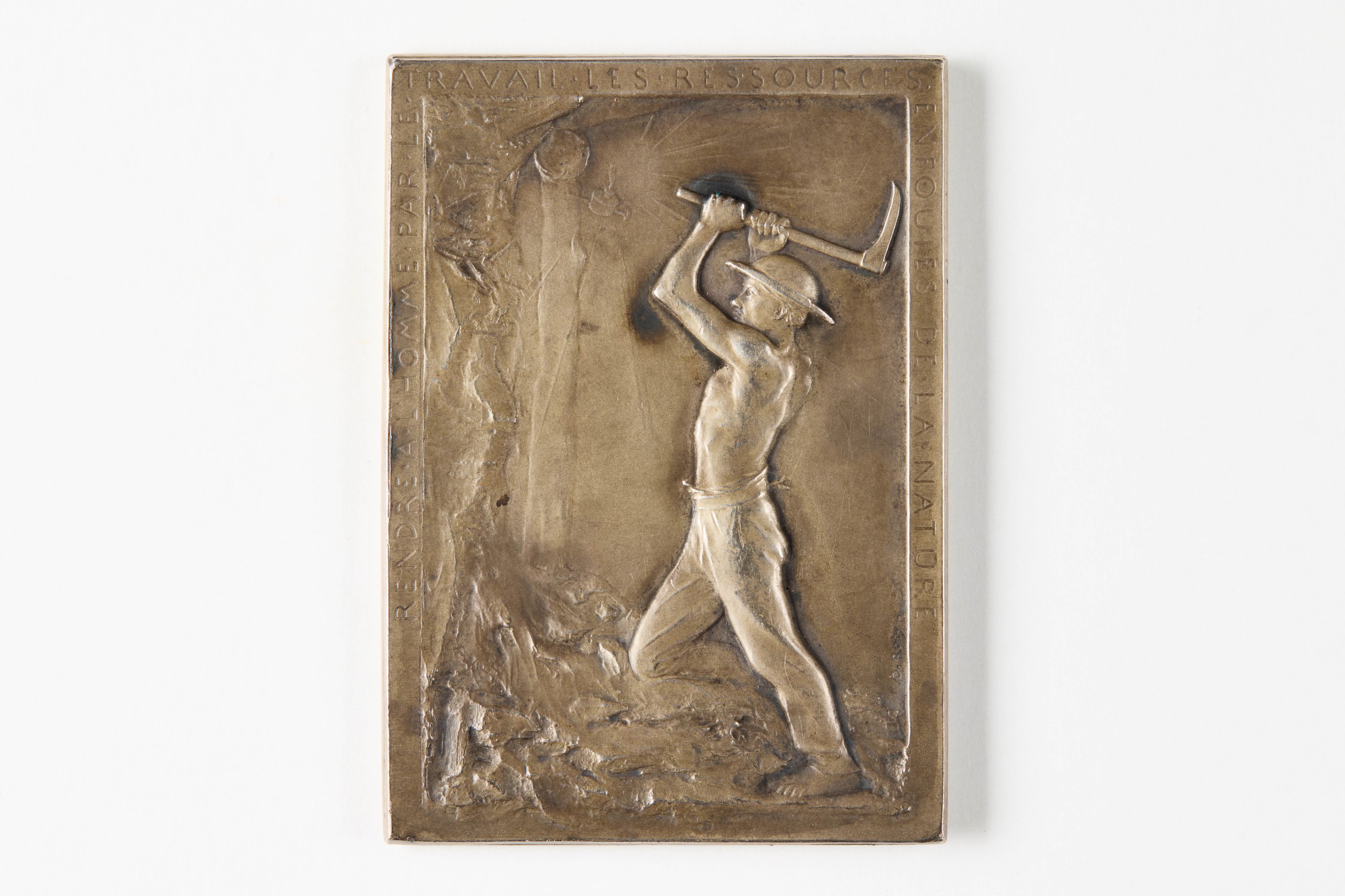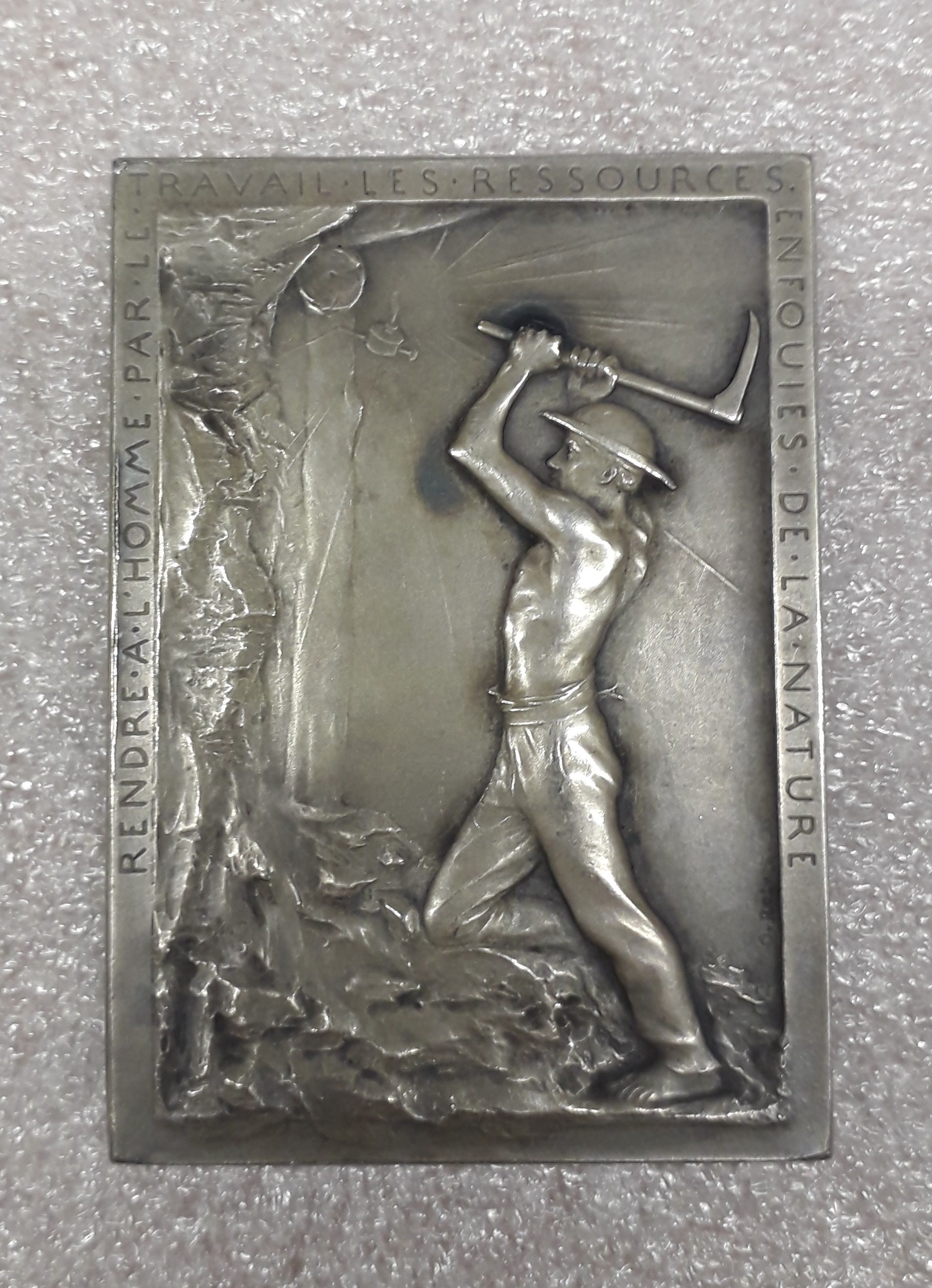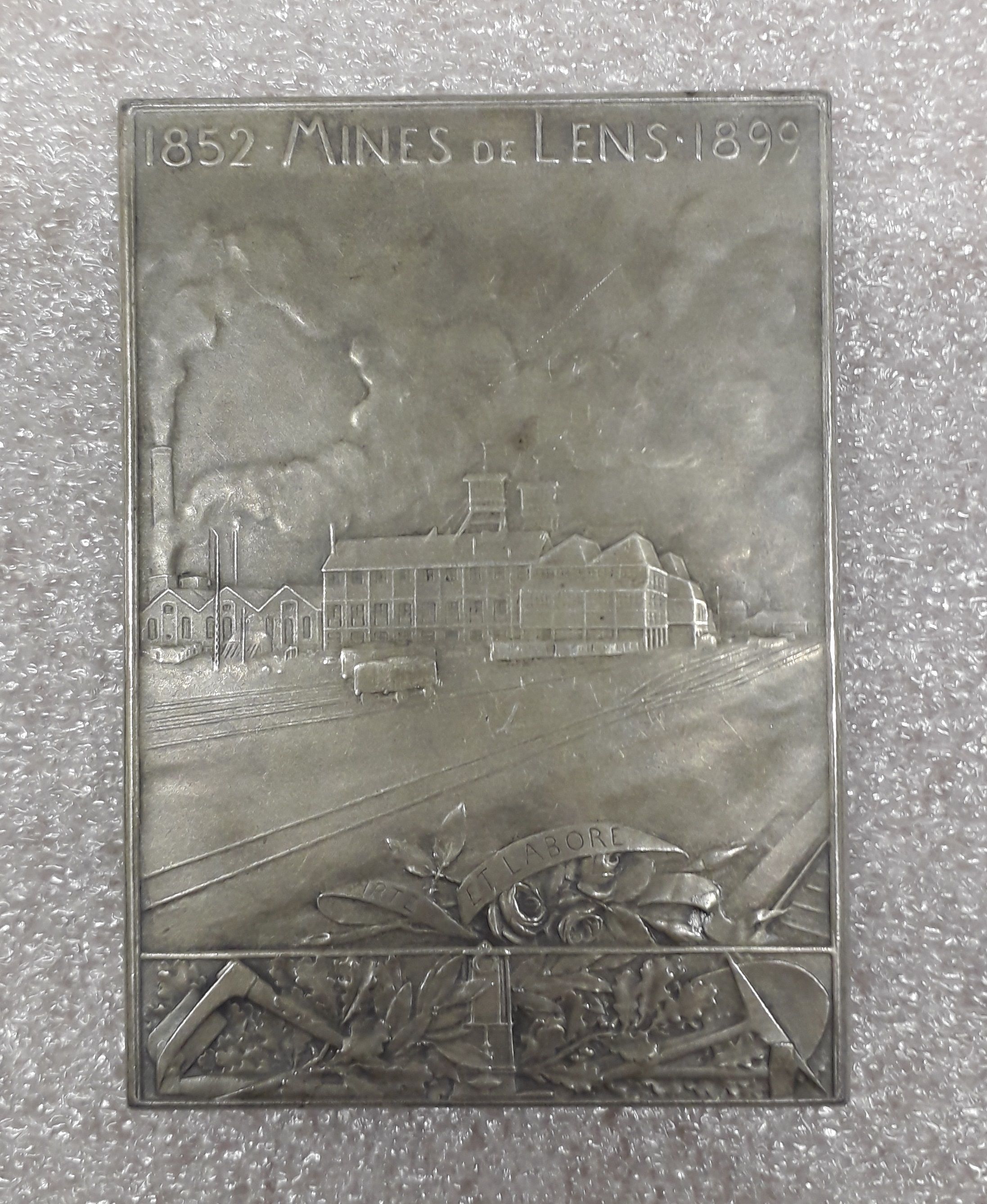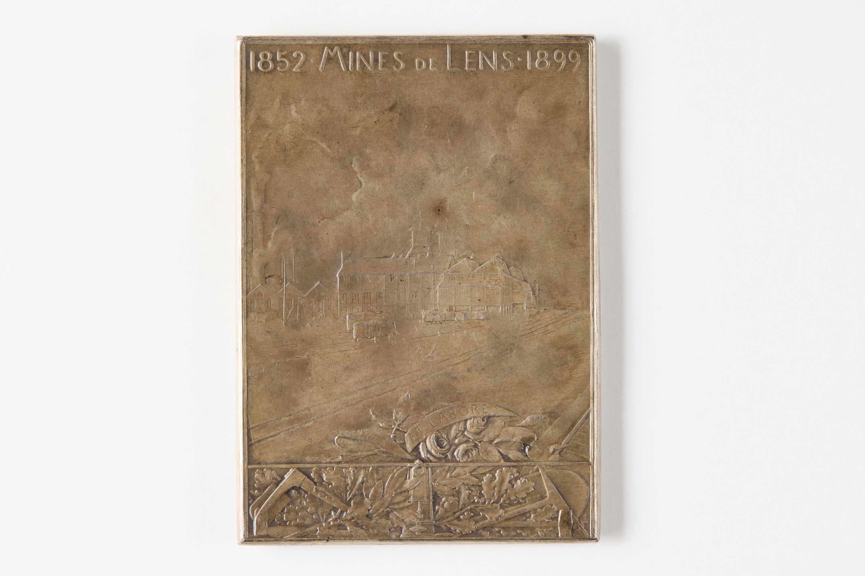 Médaille rectangulaire en bronze argenté avec sur lavers la représentation dun mineur torse nu en train dabattre du charbon. Linscription « Rendre à lhomme par le travail les ressources enfouies de la nature » encadre la scène. La signature du graveur Oscar Roty est visible en bas à droite. Au revers, une vue de la Fosse n°8 des Mines de Lens est surmontée de la mention « 1852 Mines de Lens 1899 ». 1852 correspond à la date d'ouverture de la première fosse de la Société des Mines de Lens. En 1899, le cap des trois millions de tonnes de charbon est atteint.
