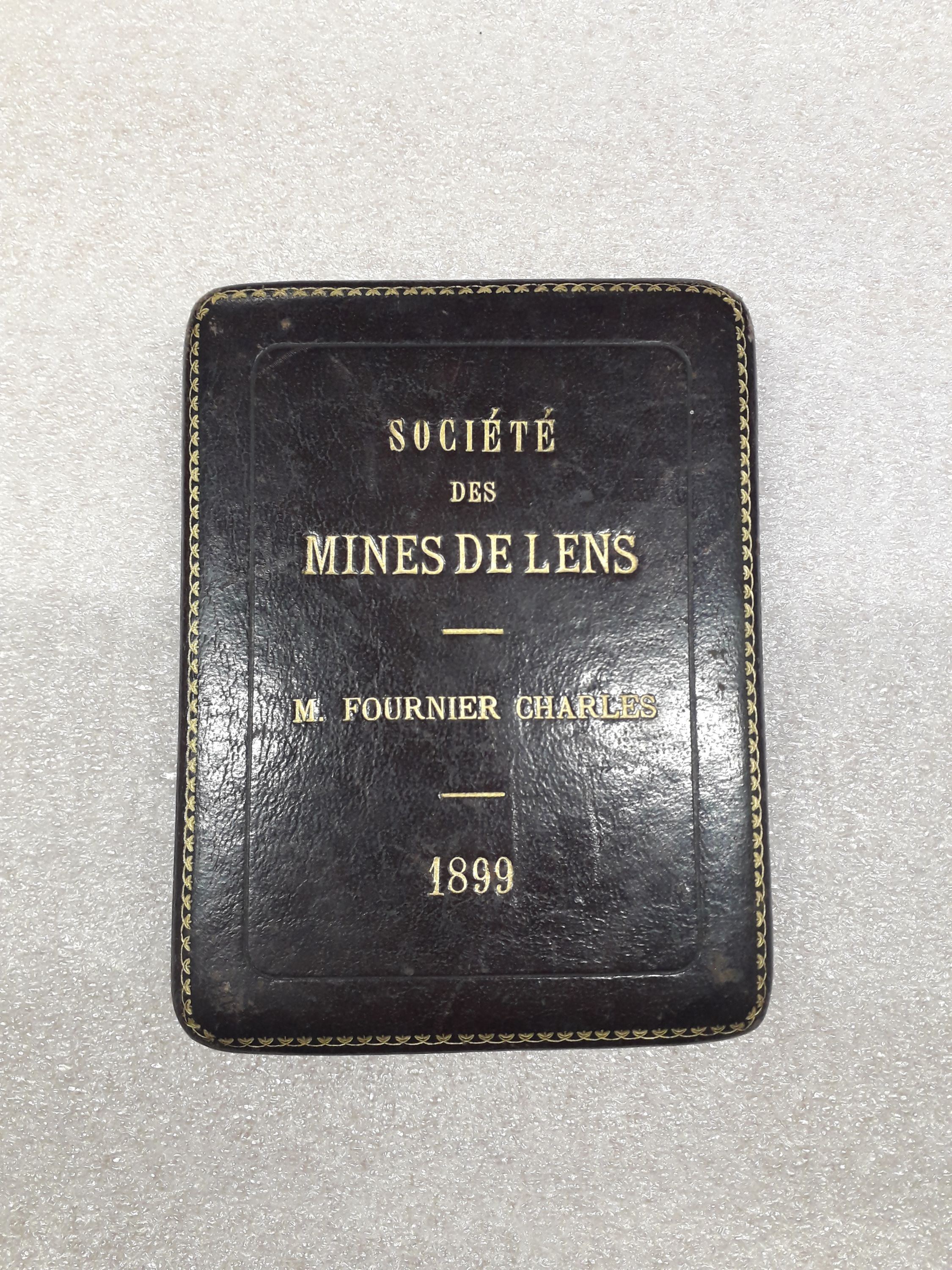 En partie inférieure, on trouve un trophée doutils de mineur accompagné de rameaux de chêne et dun bouquet de roses avec un ruban « Arte et Labore ». La médaille est conservée dans son écrin dorigine en cuir avec la mention « Société des Mines de Lens - M. Fournier Charles - 1899 ».