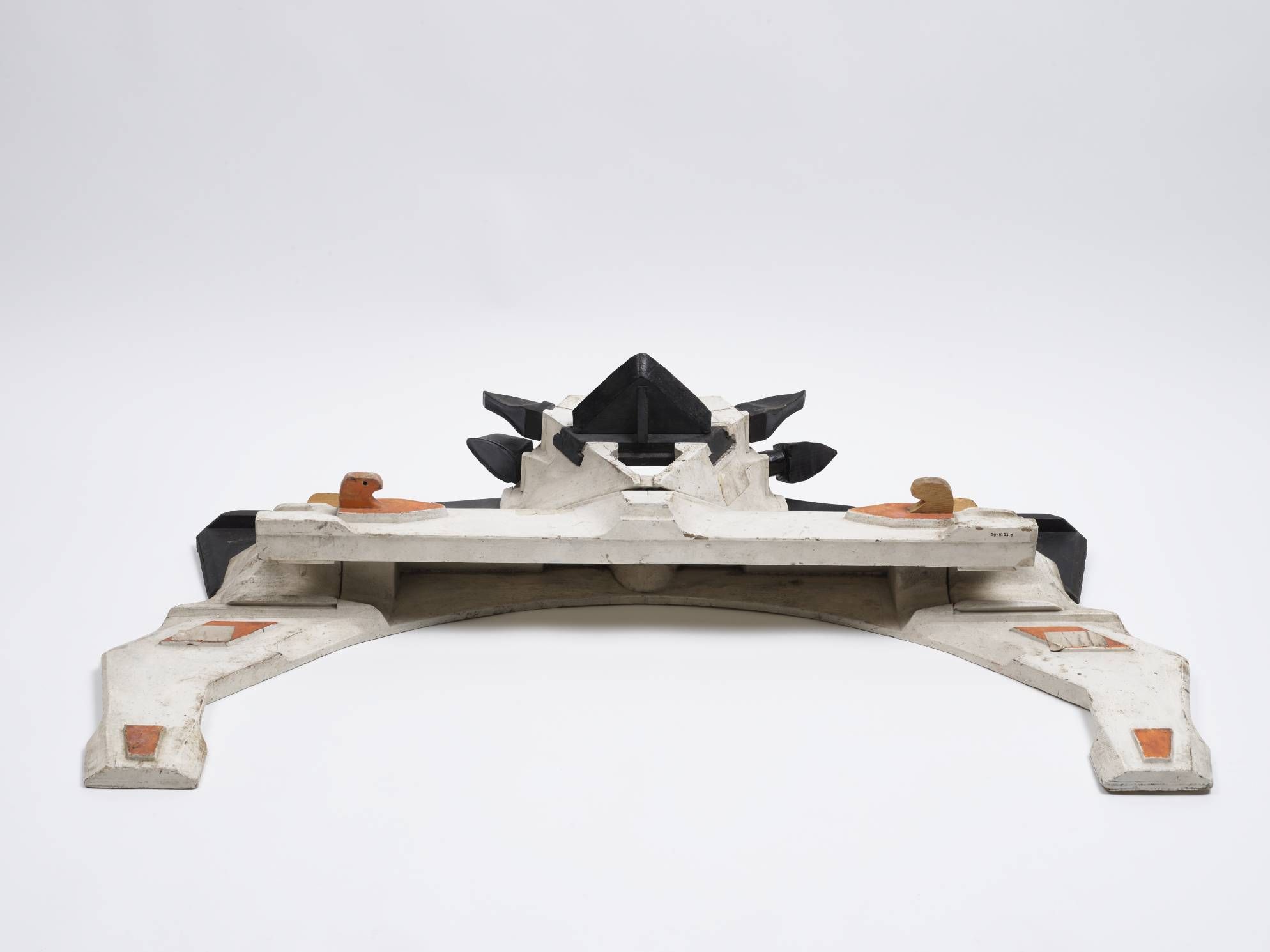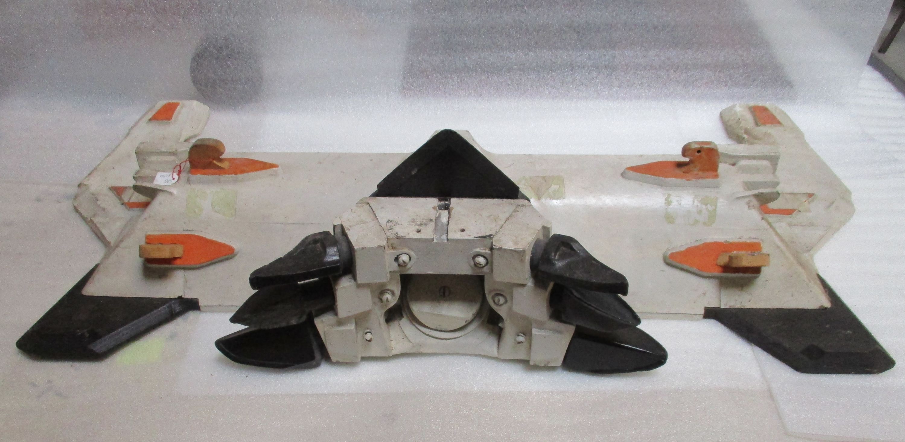 Maquette en bois peint en blanc, noir et orange représentant un rabot sans convoyeur.