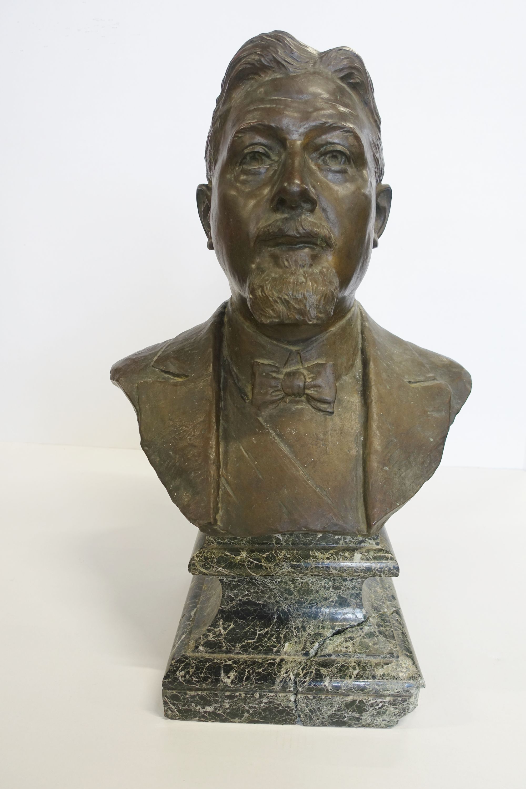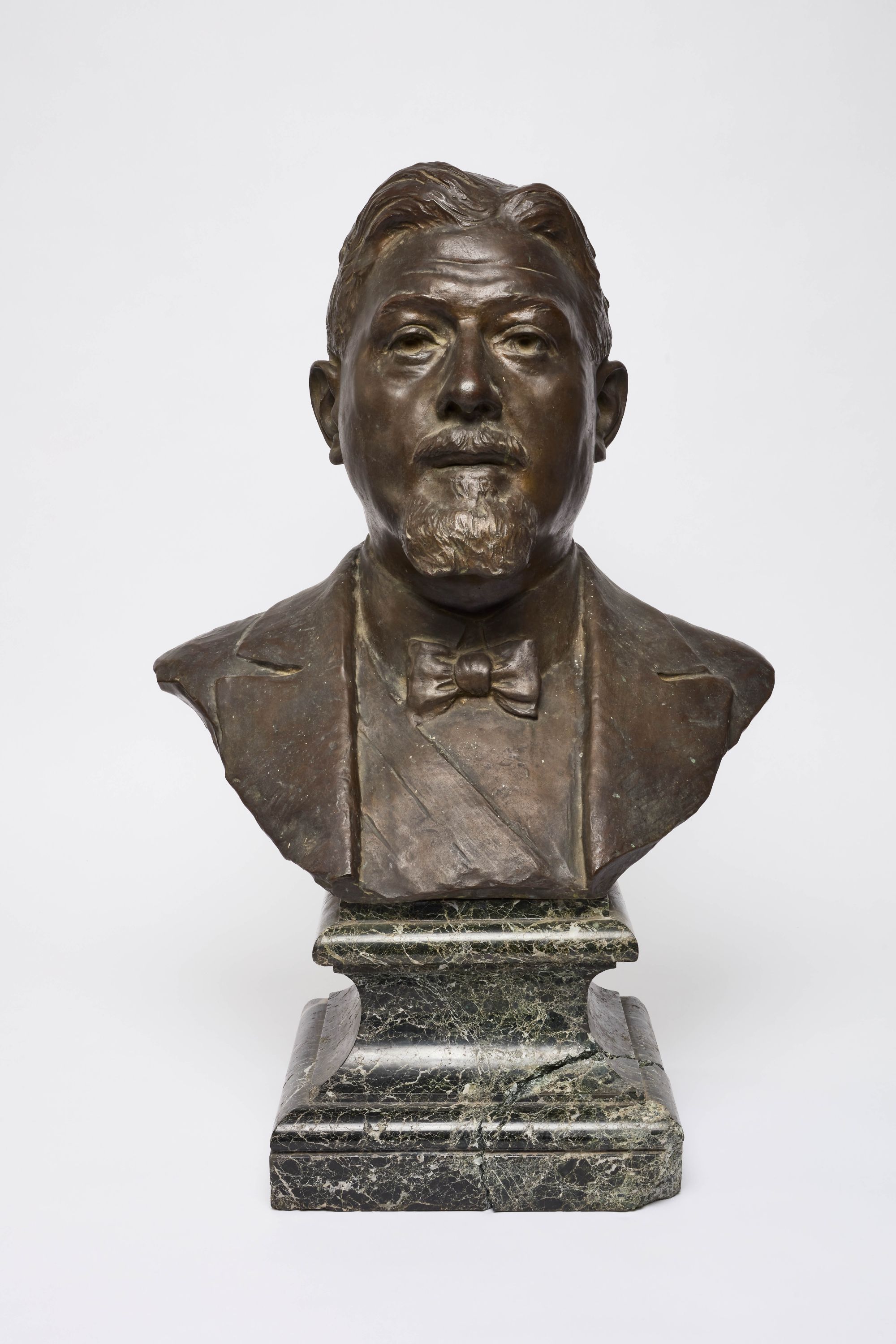 Buste de Charles Goniaux réalisé par Maurice Rogerol. Cette sculpture est en bronze patiné sur un socle en marbre. Elle représente le sujet en costume.