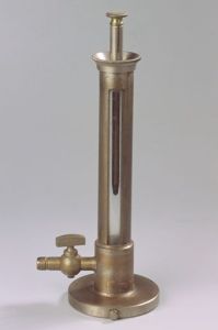 Description : Cylindre en verre sur socle arrondi en métal avec un robinet