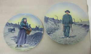 Description : Médaillon circulaire avec la représentation d\'un mineur reconnaissable à son casque avec une lampe au chapeau et à son pic marchant devant une chevalement.