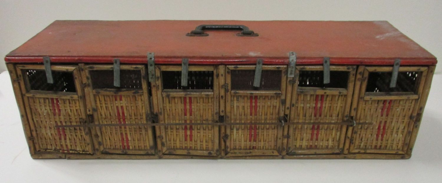 Description : Panier à enlogement pour pigeons voyageurs avec six portes en façade correspondant au cloisonnement du panier.