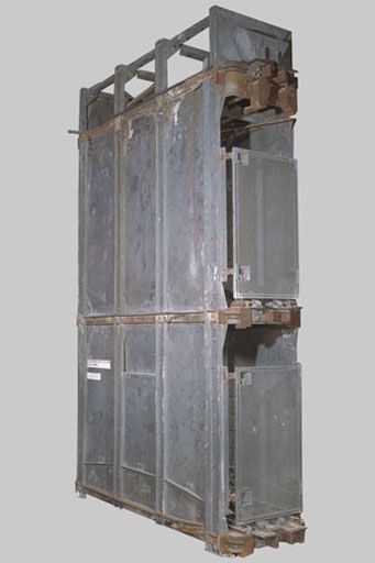 Description : Cage à deux étages munie d\'un système de sécurité appelé \"parachute fontaine\" utilisée pour la descente et la remontée du personnel ou du charbon.