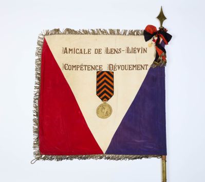 Aspect général : bon état Créateurs : MORANGE-CANDAS Création / Exécution : exécution : MORANGE-CANDAS France, Nord-Pas-de-Calais, Pas-de-Calais, Arras (lieu d\'exécution) Date : 20e siècle 2eme moitié Date d'utilisation : 2e moitié 20e siècle Date de création : 15/11/2024 10:27 Date de dernière modification : 12/09/2025 11:39 Date du constat d'état : 14/11/2017 Description : Drapeau tricolore (bleu, blanc et rouge) avec un mât en bois surmonté d\'un pic.De chaque côté, l\'inscription est accompagnée d\'une médaille.Au recto: \"Mineurs décorés de la Médaille des Mines Courage Fierté H.B.N.P.C\"Au verso: \"Amicale de Lens-Liévin Compétence Dévouement\".L\'ensemble se range dans une sacoche en toile. Diffusion : Publique Domaine(s) DMF : Patrimoine tech, scient ou issu de mine Dénomination : drapeau Dénominations : drapeau Identifiant : 13 075 Identifiant universel unique : oai:collections.chm-lewarde.com:gestion/publicationNotices/107952 Illustrations : 1999.10971-0341.jpg (627,28 ko) CAMPAGNE LEWARDE 2024_SESSION 11999.10971-0342.jpg (691,43 ko) CAMPAGNE LEWARDE 2024_SESSION 110971-3.jpg (739,47 ko)10971-1.jpg (824,6 ko)10971-2.jpg (658,04 ko) Index lieux de création : Arras Index matières : Soie (textile) ; Métal ; Bois ; Cuir ; Toile ; Fil de métal ; Broderie Index utilisations/destinations : honorifique Lien : https://collections.chm-lewarde.com/ws/gestion/app/dataBrowser/record/display?tId=57&recId=107952 Localisation permanente : Réserve 1er étage - Local estampes A3 Marques et inscriptions : nom de l\'utilisateur Français Matières et techniques : Soie (textile) Métal Bois Cuir Toile Fil de métal Broderie Mesures : Hauteur en cm : 217Longueur en cm : 89Largeur en cm : 8 Nombre d'objets : 1 Nombre de parties : 2 Notes sur le constat d'état : sacoche trouée et usée, effilochage Numéro d'inventaire : 99.10971 Oeuvre du domaine public : Oui Où : Arras Quand : 2e moitié 20e siècle Qui : MORANGE-CANDAS Quoi : Patrimoine tech, scient ou issu de mine ; drapeau Source : CHM Lewarde - Espace de gestion Utilisation / Destination : honorifique 2e moitié 20e siècle |