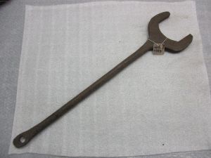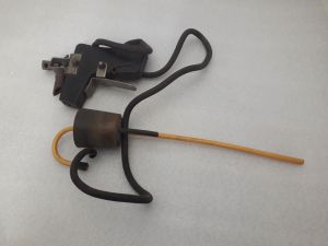 Description : Aiguille pour réparer les câbles plats métalliques avec une poignée en caoutchouc et la partie arrière en bois.