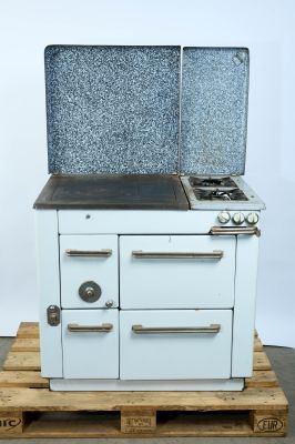 Description : Cuisinière en métal émaillé en blanc avec trois boutons, quatre portes en façade.