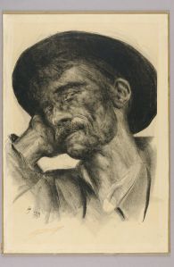 Description : Fusain de Lucien Jonas représentant trois mineurs dont un galibot devant la cage.