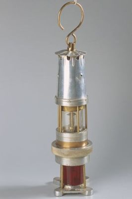 Description : Lampe de mine grisoumétrique fonctionnant à l\'essence.La mèche surmontée d\'une spirale métallique se déforme sous l\'effet de la chaleur, établissant un contact électrique mettant en service une ampoule électrique de 2,5 volts placée sous le réservoir. Cette dernière est entourée d\'un verre rouge protégé par quatre montants en laiton. L\'appareil permet de signaler des teneurs en grisou comprises entre 1,25 et 2,5 %.
