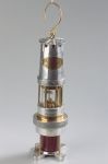 Description : Lampe de sûreté à huile composée d\'un réservoir surmonté d\'un verre et d\'un tamis protégé par une cuirasse en aluminium. Le réservoir est particulièrement petit. La lampe devait servir à un ingénieur qui descendait au fond pour des durées limitées.