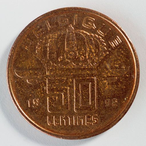 Description : Pièce de monnaie belge de 50 centimes: au recto, la valeu...