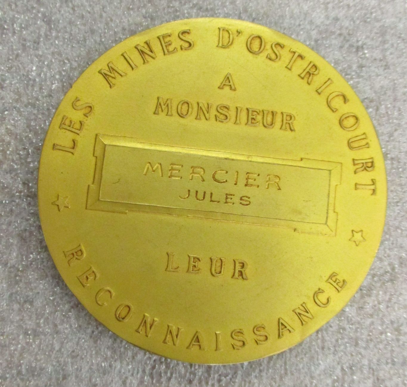 Description : Médaille « Les Mines d'Ostricourt à Mercier Jules leur re...
